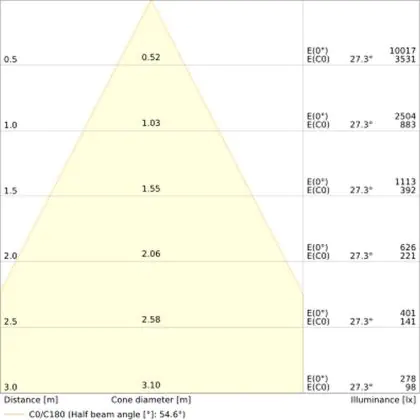 The colour code is a combination of colour rendering (CRI) and light colour (Kelvin). The first number indicates the colour rendering (1 = very poor colour rendering, 9 = maximum colour fastness). The second and third number contains the light colour. Example: the colour code 830 consists of good colour rendering (8) and warm white light (3000K).